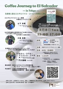 セミナー開催のお知らせ(東京) 2026年2月12日 イベント by TASHIROSHUICHI. 3月8日(日)15:00-17:00 JICA東京セミナールーム411号室 『Coffee Journey to El Salvador – in Tokyo – 生産者と語るエルサルバドル・コーヒーの歴史と未来』 お申し込みはこちらから(↓)*3月14日(土)の大阪開催とお間違えのないようお願い申し上げます 前の記事 次の記事